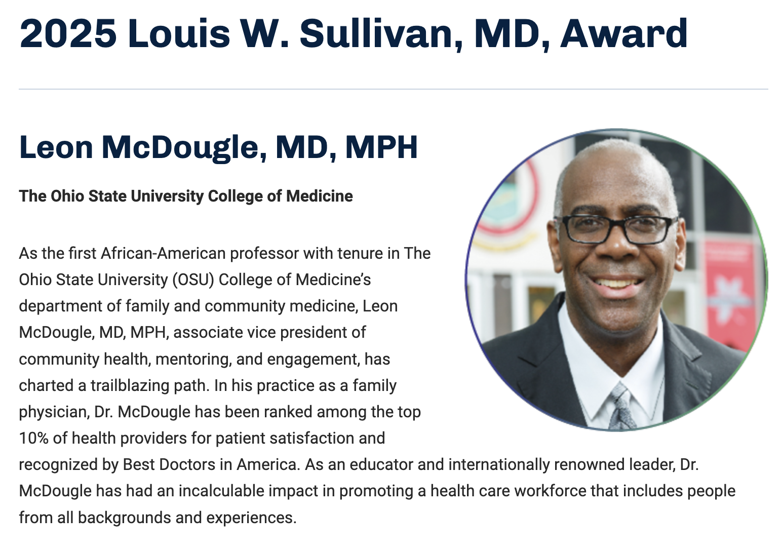 Congratulations to Leon McDougle, MD, MPH, member of the Cobb Institute Board of Directors and the first African-American professor with tenure in The Ohio State University (OSU) College of Medicine’s department of family and community medicine, on receiving the 2025 Louis W. Sullivan, MD, Award from the AAMC. Read the full announcement and register to join the virtual ceremony on October 22nd here.