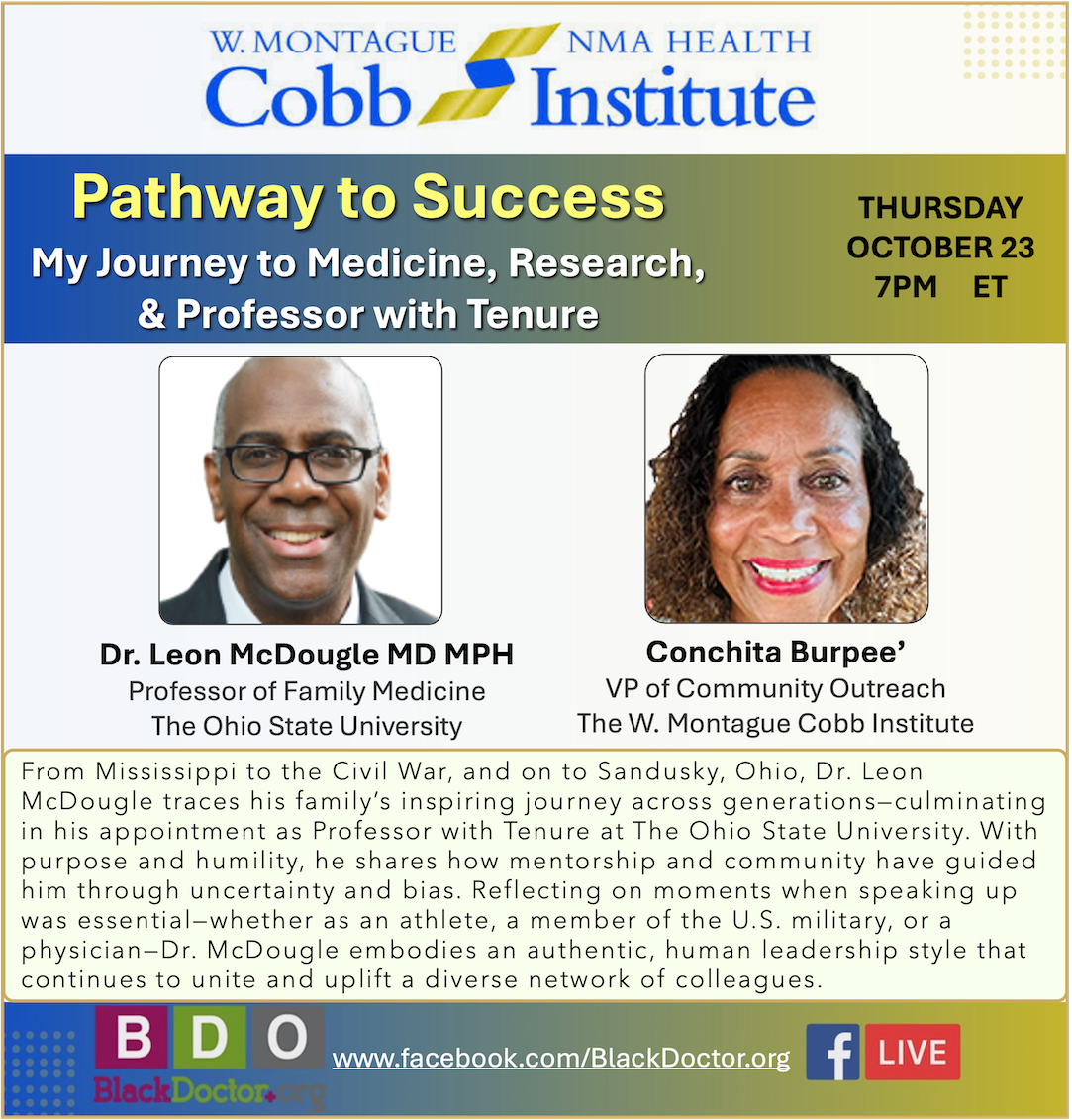 For the Cobb Institute Monthly show with BDO this May we celebrate Memorial Day and observe both Military Appreciation Month and Mental Health Awareness Month, discussing how trauma-informed care exists at the crossroads of community mental health and military experiences. Join us with BlackDoctor.org for a webinar on FACEBOOK LIVE on Thursday May 29 at 7:00pm ET. SIGN UP TO RECEIVE THE LIVE LINK HERE. ADD TO YOUR CALENDAR HERE. Our discussion team this month combines military experience with mental health expertise. Host Dr. Doris Browne served as a Colonel in the United States Army, Medical Corps, where she also led research initiatives. Trauma surgeon Dr. Mallory Williams served in Operation Iraqi Freedom and advocates for interventions to address violence and inequities in underserved communities. Dr. Rahn Bailey serves as the Chair of Psychiatry and is Assistant Dean of Community Engagement at Louisiana State University.